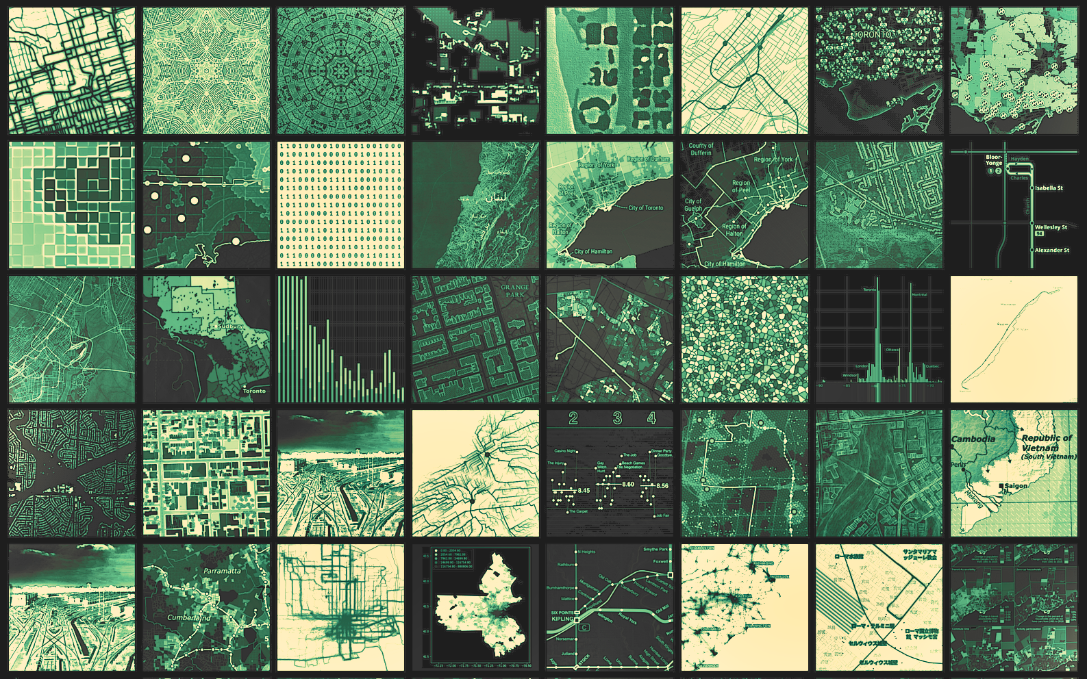 Over the years I've created hundreds of maps and related graphics. These have varied quite a bit in terms of scope, scale, process, and purpose. Here's a grid gallery of a bunch them, ordered somewhat chronologically, dating back to 2012 or so.